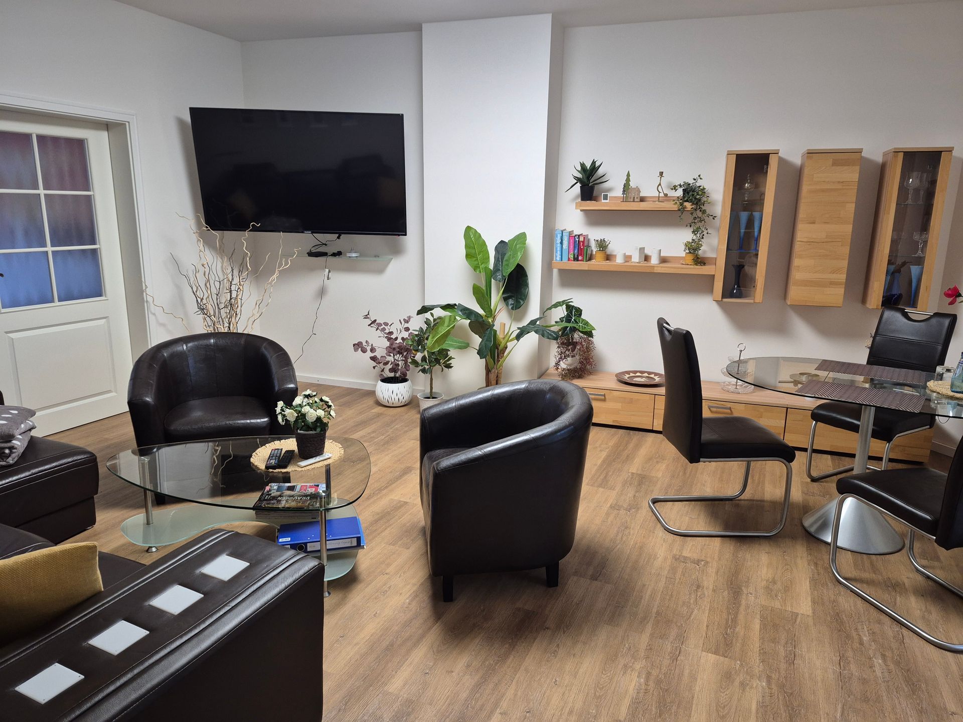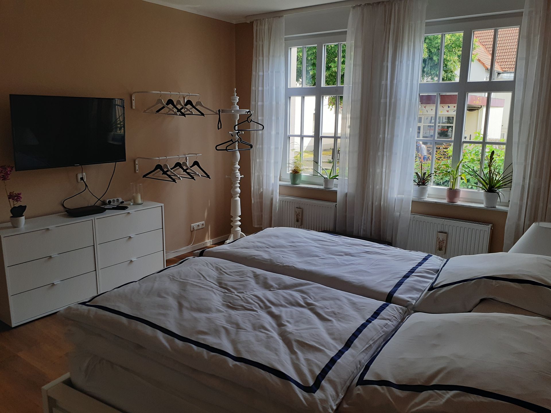 Ihre Urlaubsunterkunft liegt im EG in einem bis 2023 kernsanierten Dreifamilienhaus und umfasst ein Wohn-/Esszimmer mit sich anschließenden Wintergarten, eine Küche mit integrierter Küchenzeile, eine kleine Terrasse ist der Küche vorgelagert. Ein Tisch und zwei Stühlen sind vorhanden, ein Schlafzimmer mit einem Doppelbett 1,80 x 2,00 (Matratze mittelhart und Topper 10 cm fest) und zusätzlichen TV, sowie Hängemöglichkeiten für Ihre Bekleidung und einem Schminktisch/Laptoptisch. Im Schlafzimmer sind elektrische Rollladen vorhanden, ein Badezimmer mit bodentiefer Dusche und Waschtisch, mit Handtuchheizung und Fön sind ebenfalls vorhanden. In der Küche befindet sich eine Küchenzeile mit Herd und Cerankochfeld, eine Abzugshaube, ein Geschirrspüler, Kühl-Gefrierkombination, Toaster, Wasserkocher, Kaffeemaschine, sowie eine kleine Waschmaschine.